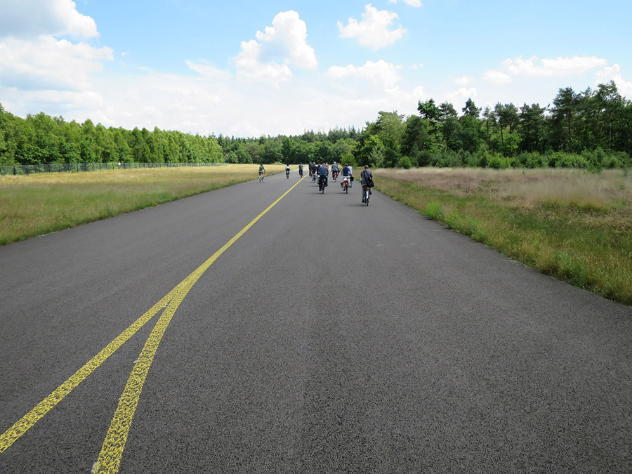 Zaterdag 27 juni was het weer zo ver: excursie achter de hekken van Defensie! Per fiets bezocht men de Duitse nep-dorpen Grosses & Kleines Heidelager op het terrein van de Oranjekazerne, de ‘Werft’ – het technische complex met zijn unieke Junkerhalle – op het luchtmachtterrein Vrijland en fietsten ze over de Rollbahn en de Duitse start- en landingsbanen. Aan het einde trok men een sportief sprintje over de huidige startbaan. Onderweg bekeken de fietsers de drie overgebleven, als boerderij vermomde vliegtuighangars en de voormalige locomotiefloods.