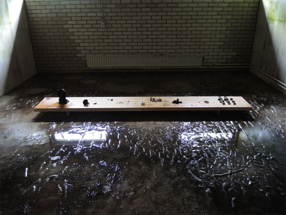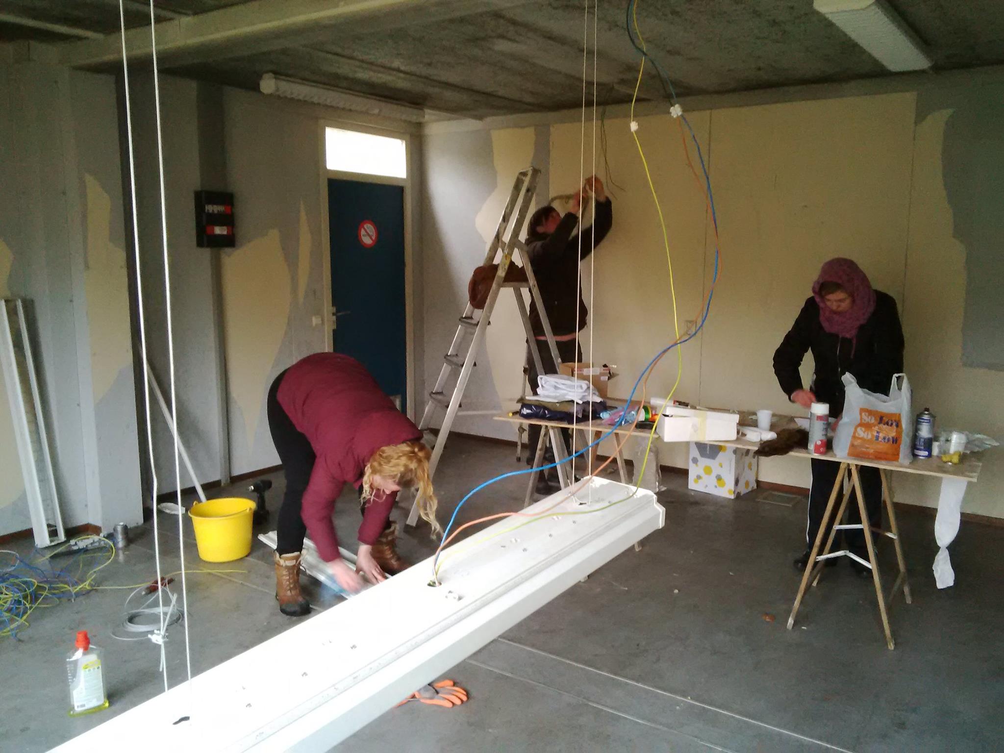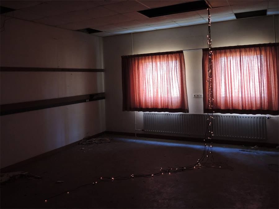 In het donkere en lekkende pand zorgde Anke voor een lichtpuntje door een waterval van licht. Stroom, afkomstig van een afgekeurd zonnepaneel op het dak, vloeit door een streng van aan elkaar gesoldeerde fietslampjes. Hoe sterker de zon schijnt des te feller branden de lampjes.