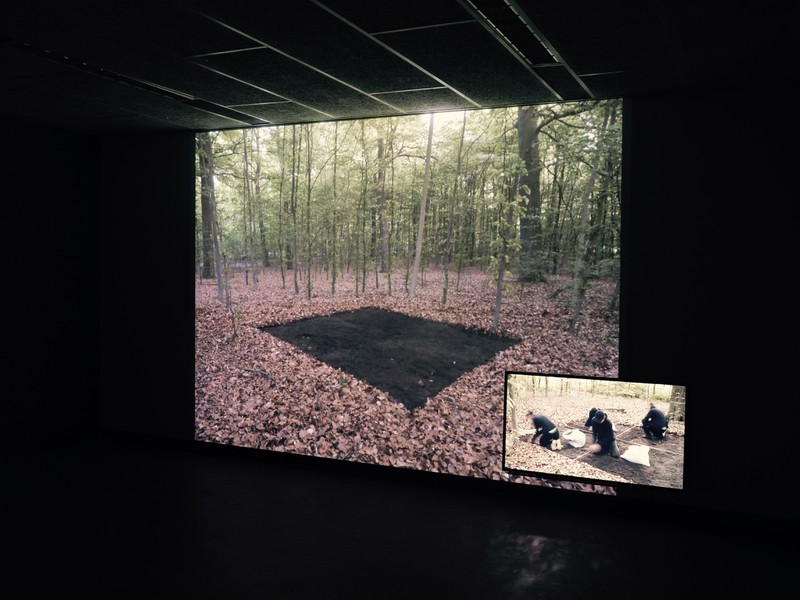 In het bos, een uur voor zonsondergang. Op de grond is een vierkant uitgezet van vier bij vier meter. Binnen dit vierkant halen vier werkers de takken, bladeren en grond weg en verzamelen dat in witte zakken. De volle zakken dragen zij een voor een het bos uit. Bij zonsondergang (21:23) heeft iedereen het bos verlaten, blijft voor de nacht in stilte een leeg donker vierkant achter. De volgende morgen bij zonsopgang (05:48) komen de werkers terug. Zij vullen het vierkant met het materiaal uit de meegebrachte genummerde zakken, maar nu in omgekeerde volgorde. De laatste zakken bevatten de bovenste laag, takken en bladeren. De oorspronkelijke situatie wordt zo goed mogelijk teruggebracht. www.fransvanlent.nl
