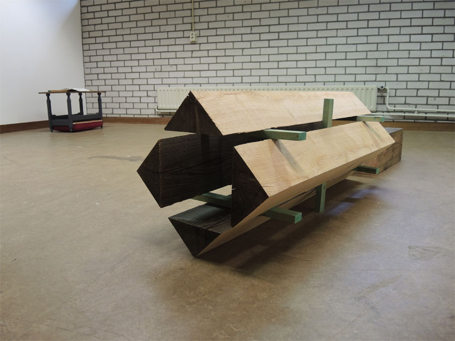 De vormen waarin de wereld aan ons verschijnt (licht, bomen, stenen), worden in het werk van Jasper van Aarle letterlijk behandeld als uitwerkingen van iets dat juist vormloos is; een aan-wezig-voerende-kracht, of een ‘iets’ in elk geval dat voor de mens geen onderling deel- en kenbare verschijning kent. Met zijn ruimtelijke beelden, tekeningen en teksten zet Jasper het innerlijke (zijn voorstellingen bij grondbegrippen als groei en verval, gang en wording) om in uiterlijke voorstellen die onderling wel deel- en zichtbaar zijn. Jasper van Aarle toonde in de Guestroom het werk Spatie (balk).